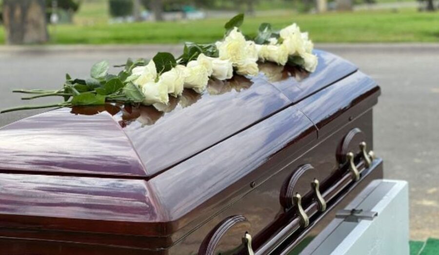 During the wedding ceremony, the groom’s friends arrived with a coffin decorated with a gift ribbon