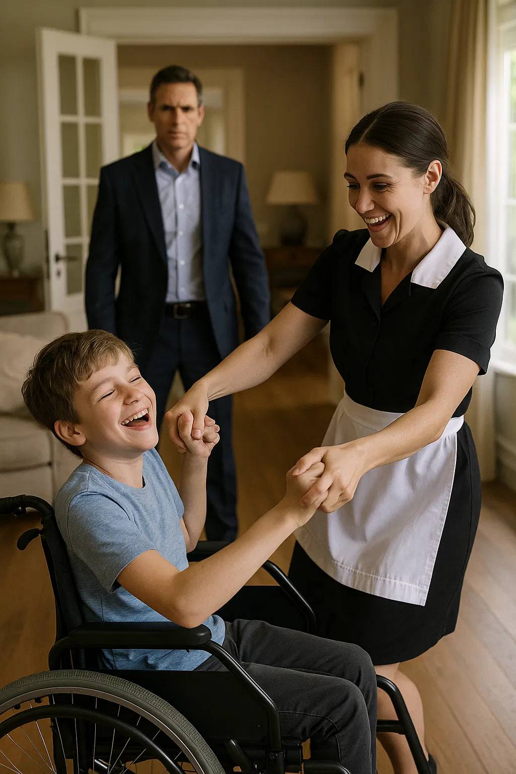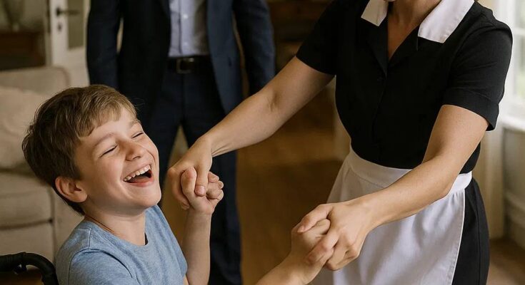 Most days, Edward Grant’s penthouse seemed like a museum—pristine, chilly, lifeless. Noah, 9, hadn’t moved or spoken in years. Doctors gave up. Hope waned. Everything changed one tranquil morning when Edward went home early and spotted his cleaner, Rosa, dancing with Noah.